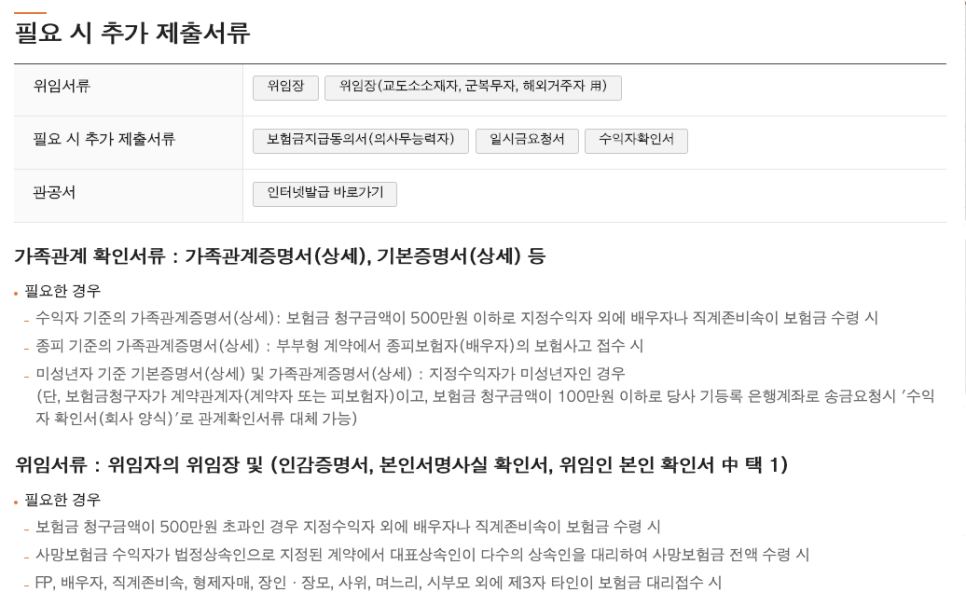 추가로 위임청구 시 수익자 기준 가족관계증명서 및 위임자의 위임장 등이 필요한데요